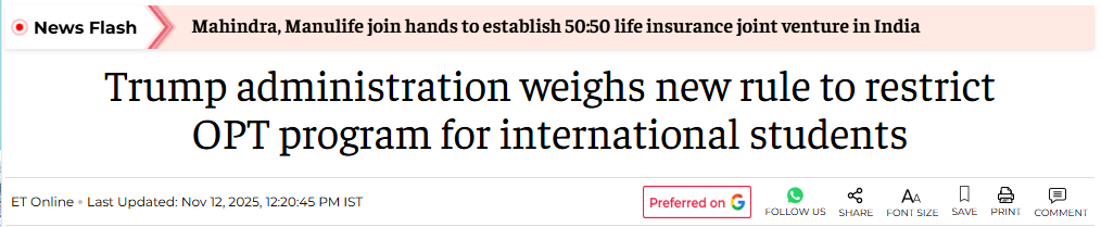 实际上,围绕F-1学生身份的调整早有迹象。今年8月,美国国土安全部(DHS)曾提出,以“固定入学期限”取代现行的“身份有效期”(D/S)政策。业内普遍认为,此举为OPT改革铺路。