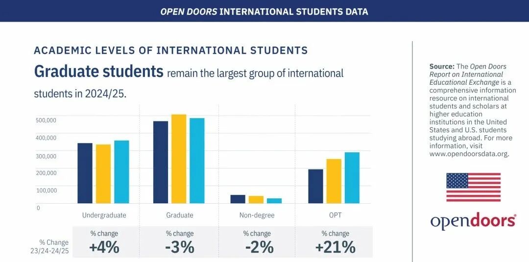 最近,一组关于留美趋势的数据频繁出现在社交媒体上。一边是《Open Doors 2025》中的强劲增长:OPT 学生人数达到 294,253 人,同比增长 21.2%,刷新近年增速。