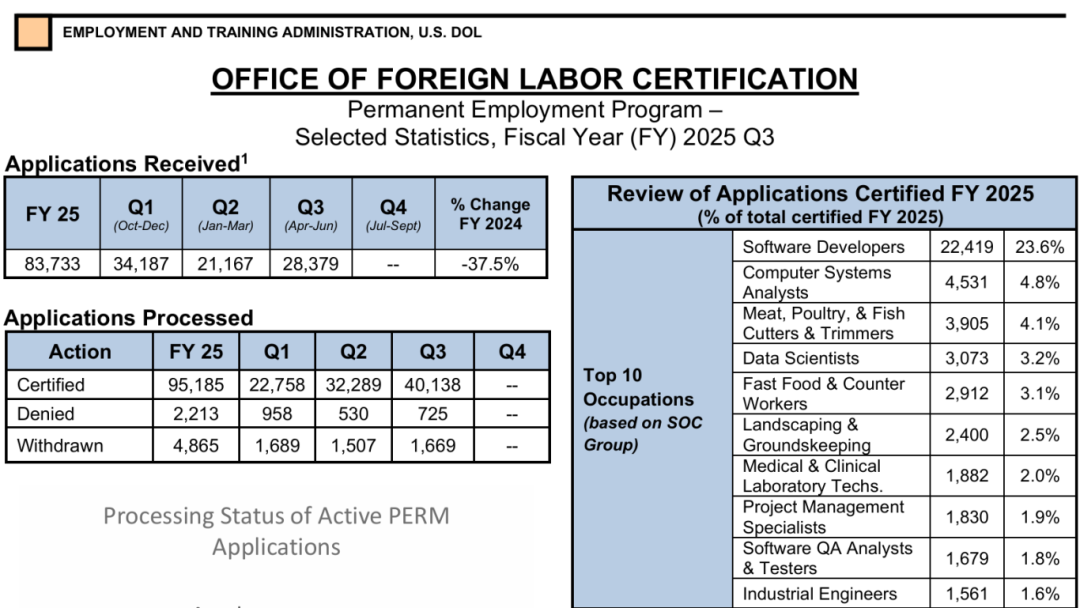 另一边,则是美国劳工部披露的最新 PERM 数据:2025 财年前三季度仅 83,733 件,同比下降 37%,单季度跌幅超过三成,触及近十年低位。