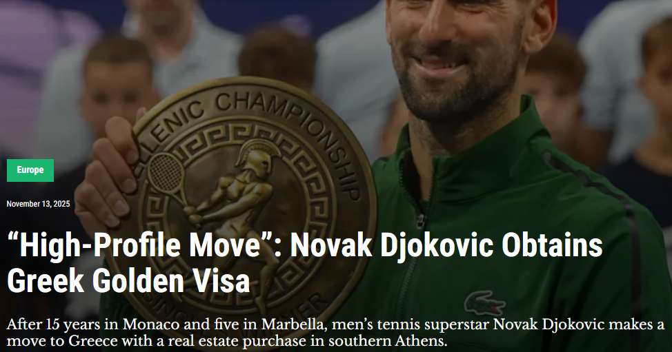 近日,多家海外媒体确认,网球名将诺瓦克·德约科维奇已正式移居希腊,成为黄金签证的知名持有者。作为男子网球历史上最成功的选手之一,德约科维奇创纪录地获得24个大满贯单打冠军、40个大师赛冠军、7个年终总冠军和101个ATP单打冠军,并八次登顶年终世界第一。他的选择,再次将希腊推向全球关注的焦点。