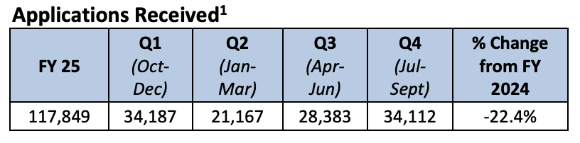 从年度数据来看,2025财年整体PERM申请量比2024财年下降约22.4%,且这一趋势贯穿四个季度,并非局部现象。