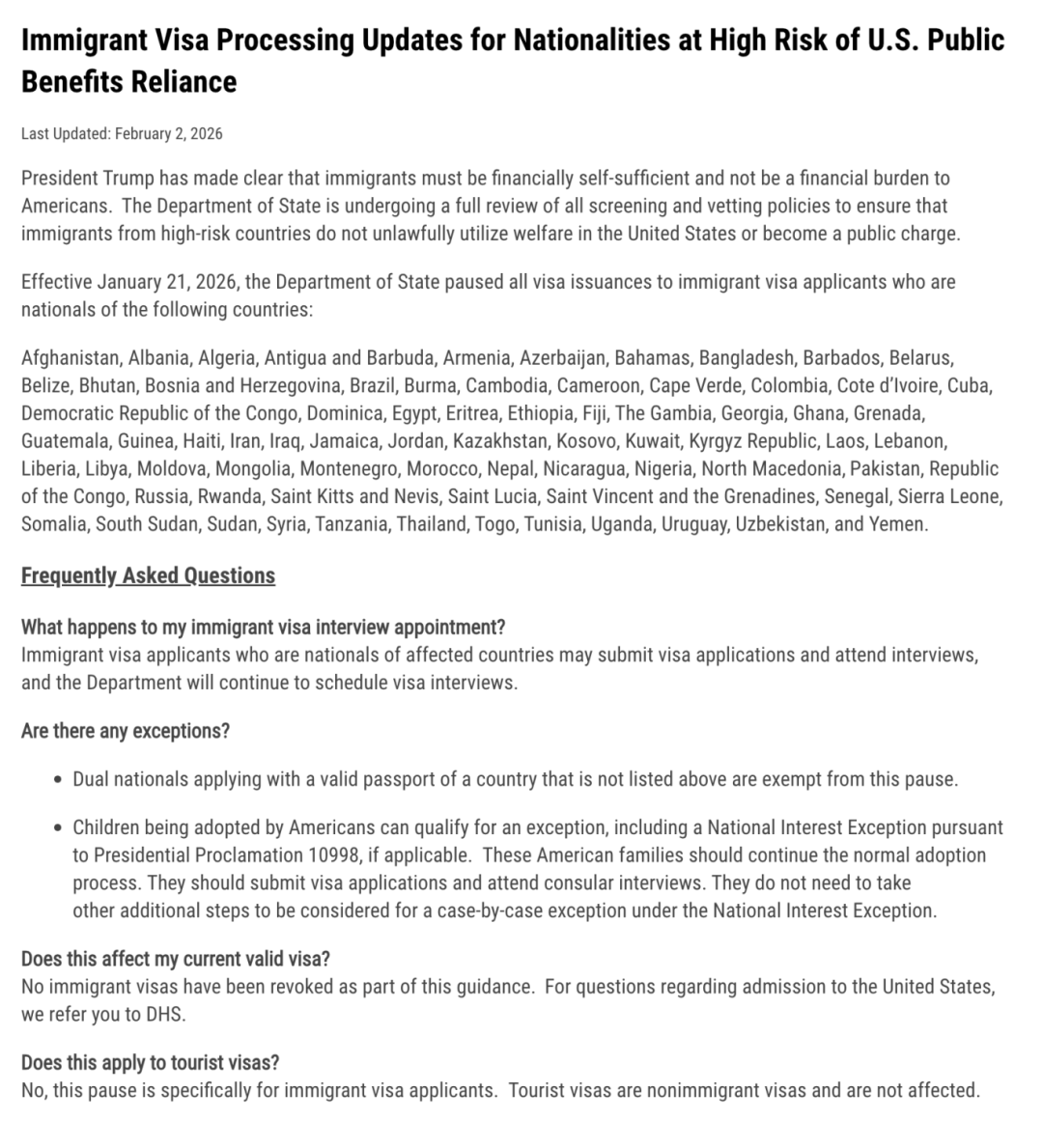 根据该政策,自1月21日起,美国将暂停向被认定为“公共福利依赖风险较高”的75个国家公民签发移民签证。暂停范围覆盖所有移民类别,包括家庭类、就业类以及其他永久居留路径。
